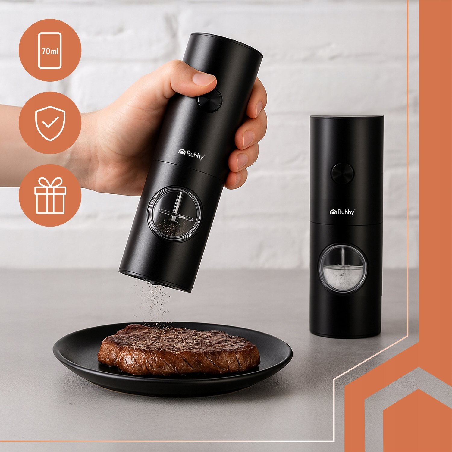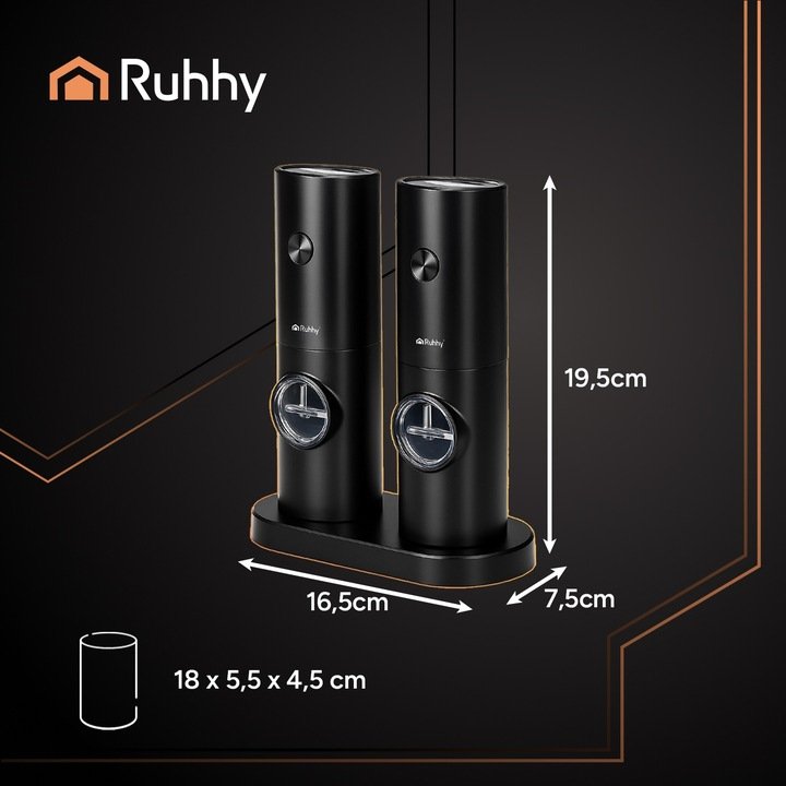 Elektrické mlýnky RUHHY v černé barvě jsou perfektní volbou pro každou kuchyň, která si cení stylu a funkčnosti.