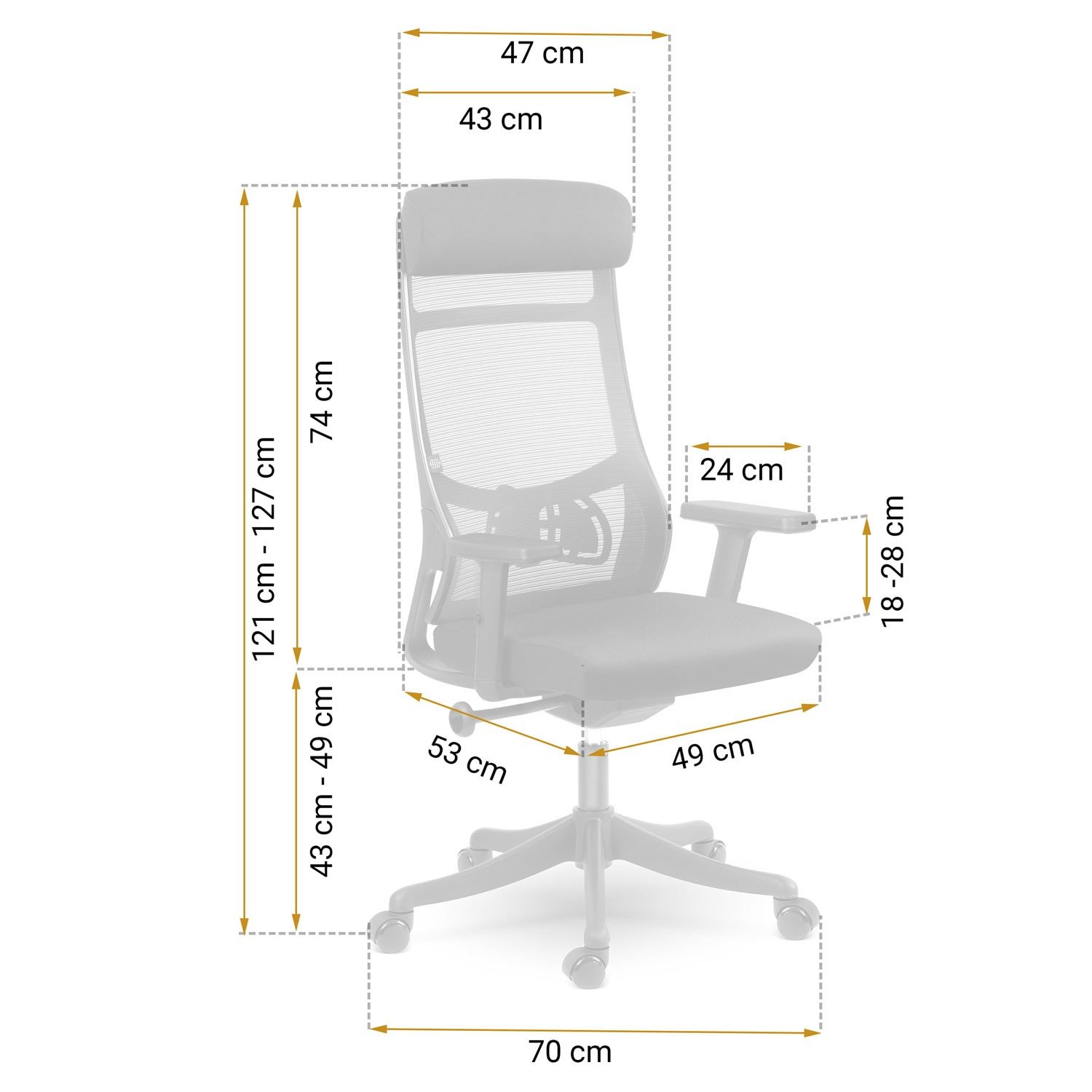 Rozměrově křeslo nabízí maximální výšku 127 cm, šířku 70 cm a výšku opěradla 74 cm. Výšku sedáku lze nastavit v rozsahu 43–49 cm, výšku područek pak v intervalu 18–28 cm. Maximální zatížení je 120 kg.