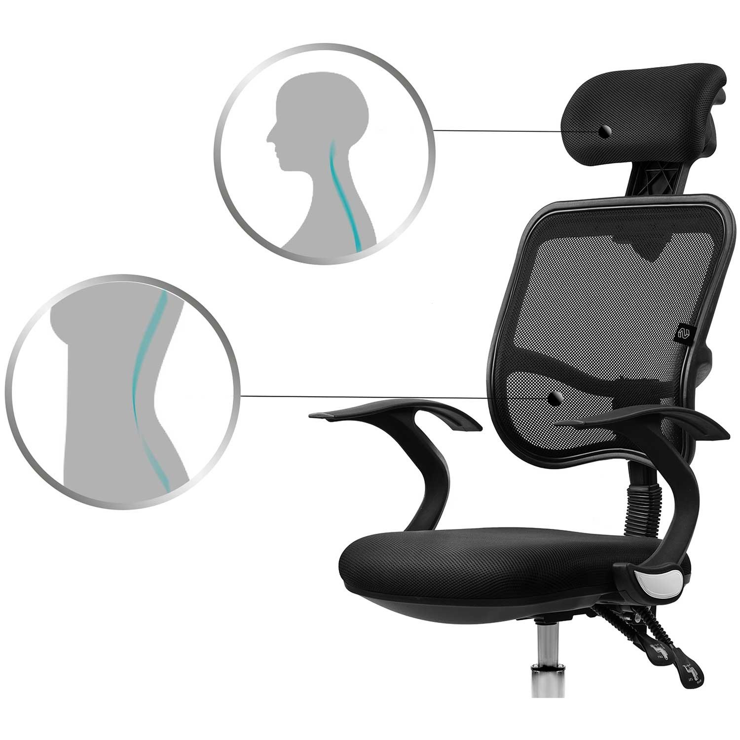 Sedák je vyplněn prodyšnou elastickou čalounickou pěnou s vysokou hustotou, která poskytuje komfort i při delším sezení. Vyprofilovaná bederní část podporuje zdravé držení těla a přizpůsobí se tvaru postavy. Střední část opěradla je vyhotovena prodyšnou síťovinou pro lepší cirkulaci vzduchu. Komfort doplňuje nastavitelný opěrák hlavy s možností změny výšky i úhlu a pohodlné područky.