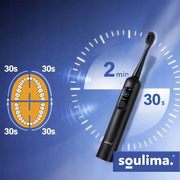 Integrovaný 2minutový časovač s upozorněním po 30 sekundách pomáhá dodržovat správnou techniku čištění. Kartáček je tichý (cca 65 dB) a jeho výkonná baterie vydrží až 60 dní na jedno nabití. Díky voděodolnosti IPX7 je vhodný i pro použití v koupelně a snadno se čistí pod tekoucí vodou.