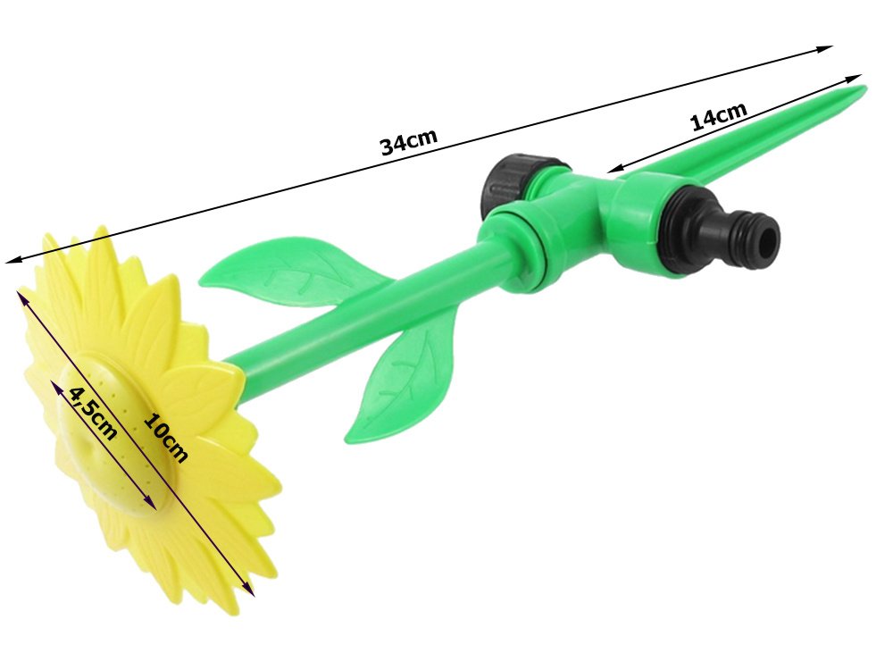 Automatický zahradní zavlažovač ve tvaru květiny. Pevná základna (zaražená do země pomocí hrotu šípu) zabraňuje převrácení postřikovače vlivem tlaku vody. Velká rozprašovací tryska na horní straně zařízení. Velmi snadné použití, vyžaduje pouze připojení hadice a odšroubování vody. Určeno pro zahradní hadici s 1/2" koncovkou.