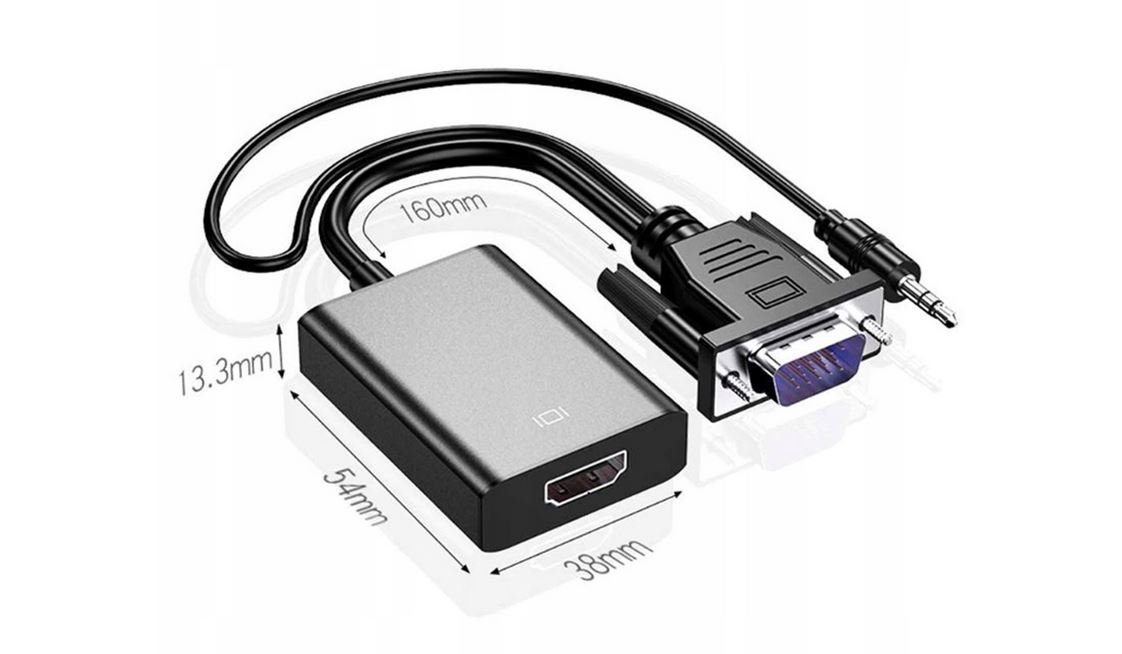 Kabel sadaptérem na každé straně pro VGA a HDMI. Kabel je cca 17cm dlouhý a adaptér VGA má vestavěný 3,5mm pomocný kabel pro přenos zvuku a adaptér HDMI má připojení Micro USB pro napájení. Jedná se opraktické a snadné řešení, pokud potřebujete připojit starší VGA zařízení přes HDMI a zároveň přenášet zvuk.