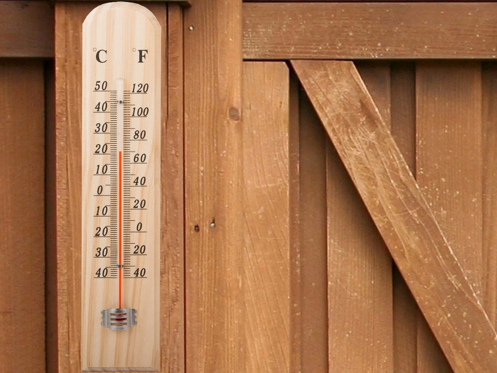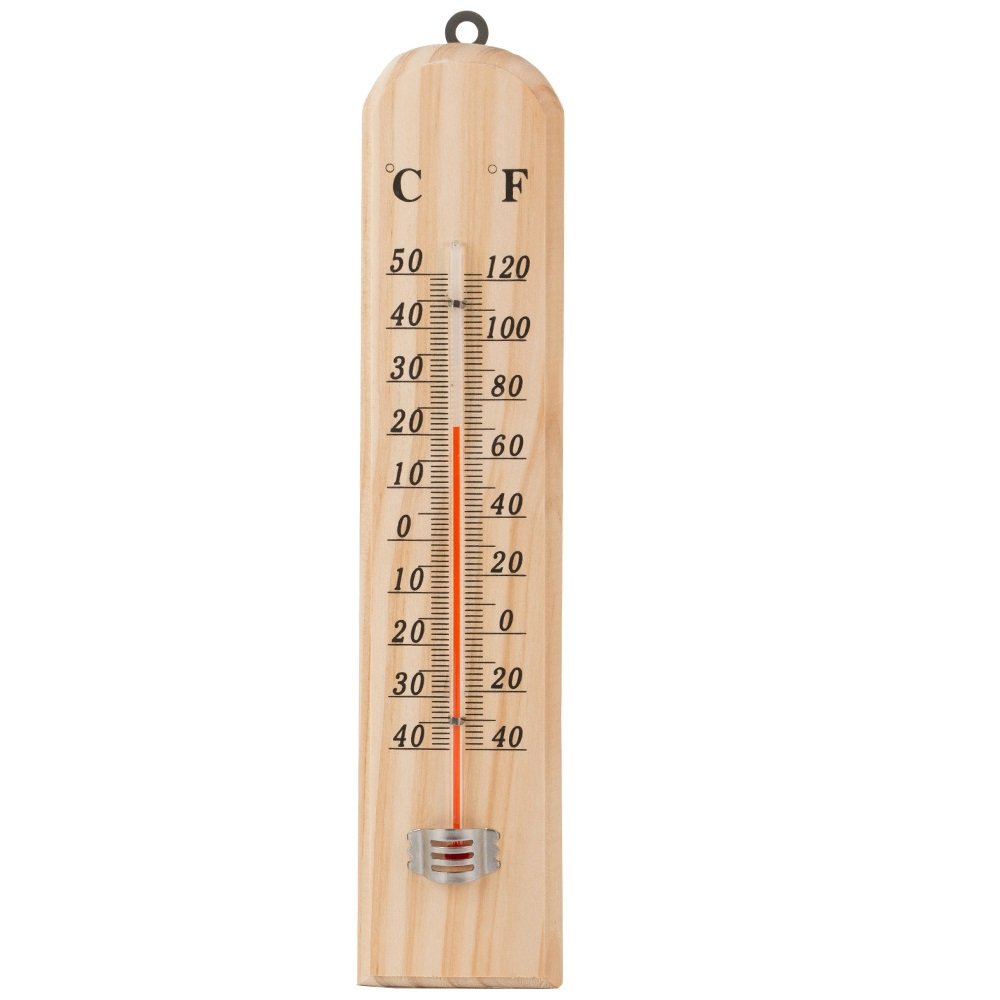 Dřevěný závěsný teploměr. Bude přesně měřit teplotu mimo budovu i uvnitř místností. Teplotní rozsah -40 až +50 stupňů Celsia (40 až 120 stupňů Fahrenheita).