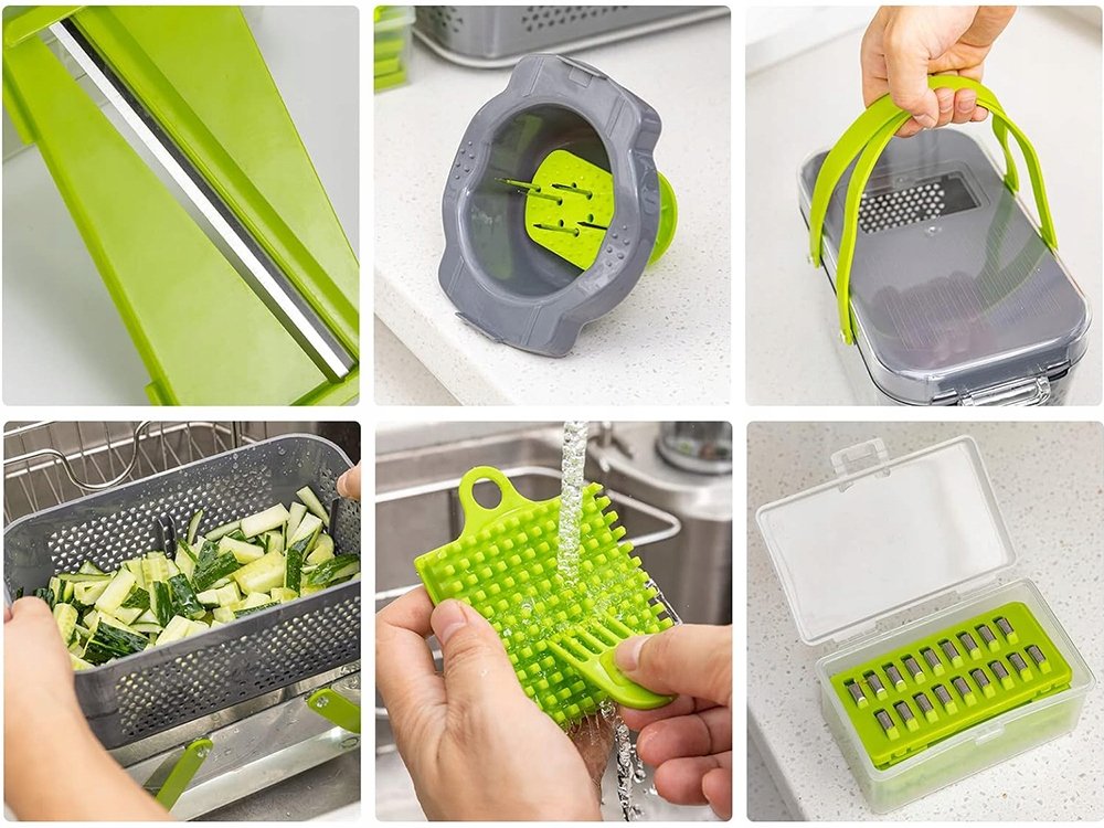 Sada kráječů na zeleninu je vybavena košem na odkapávání, do kterého lze potraviny ukládat a umývat je jako do odkapávacího koše.