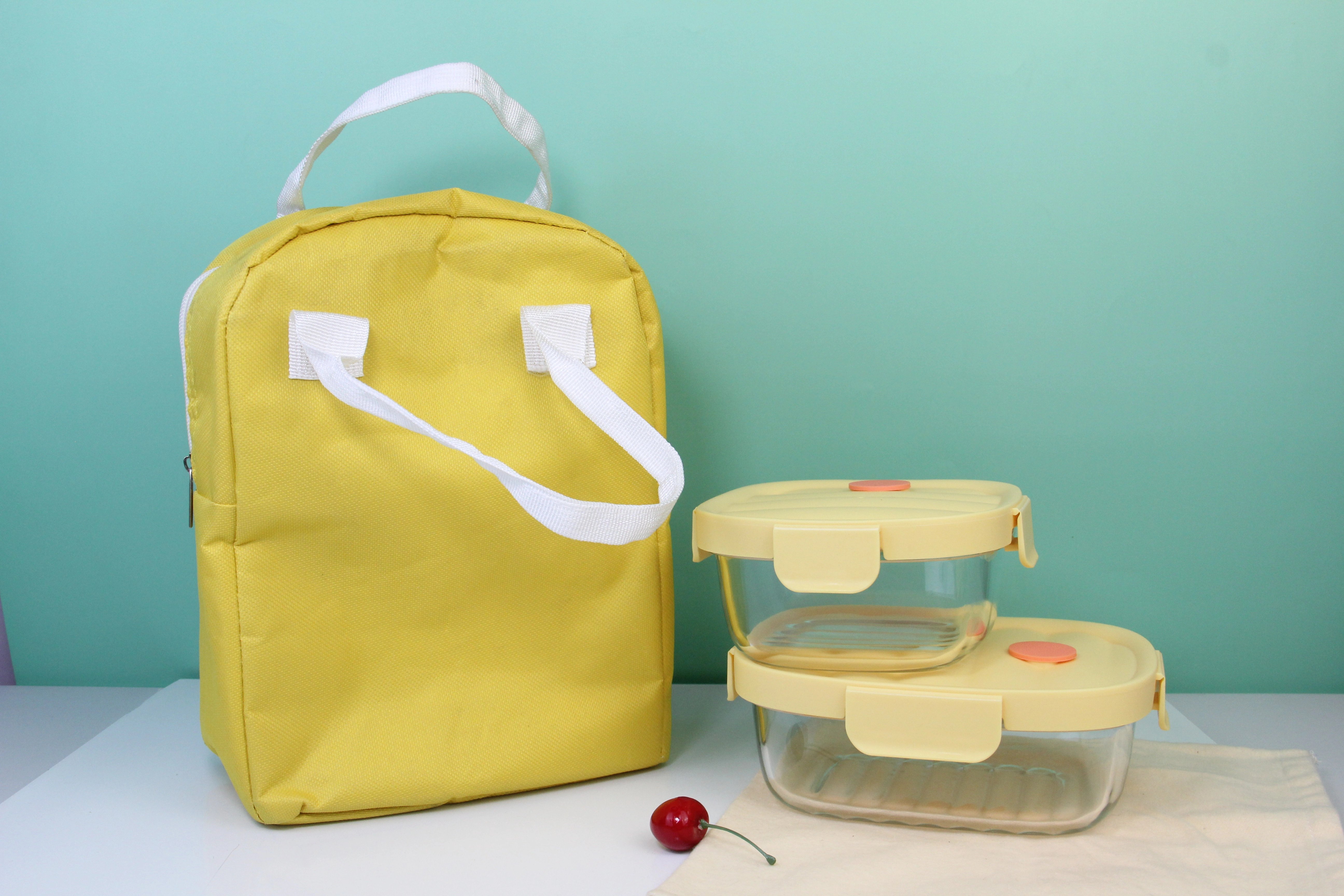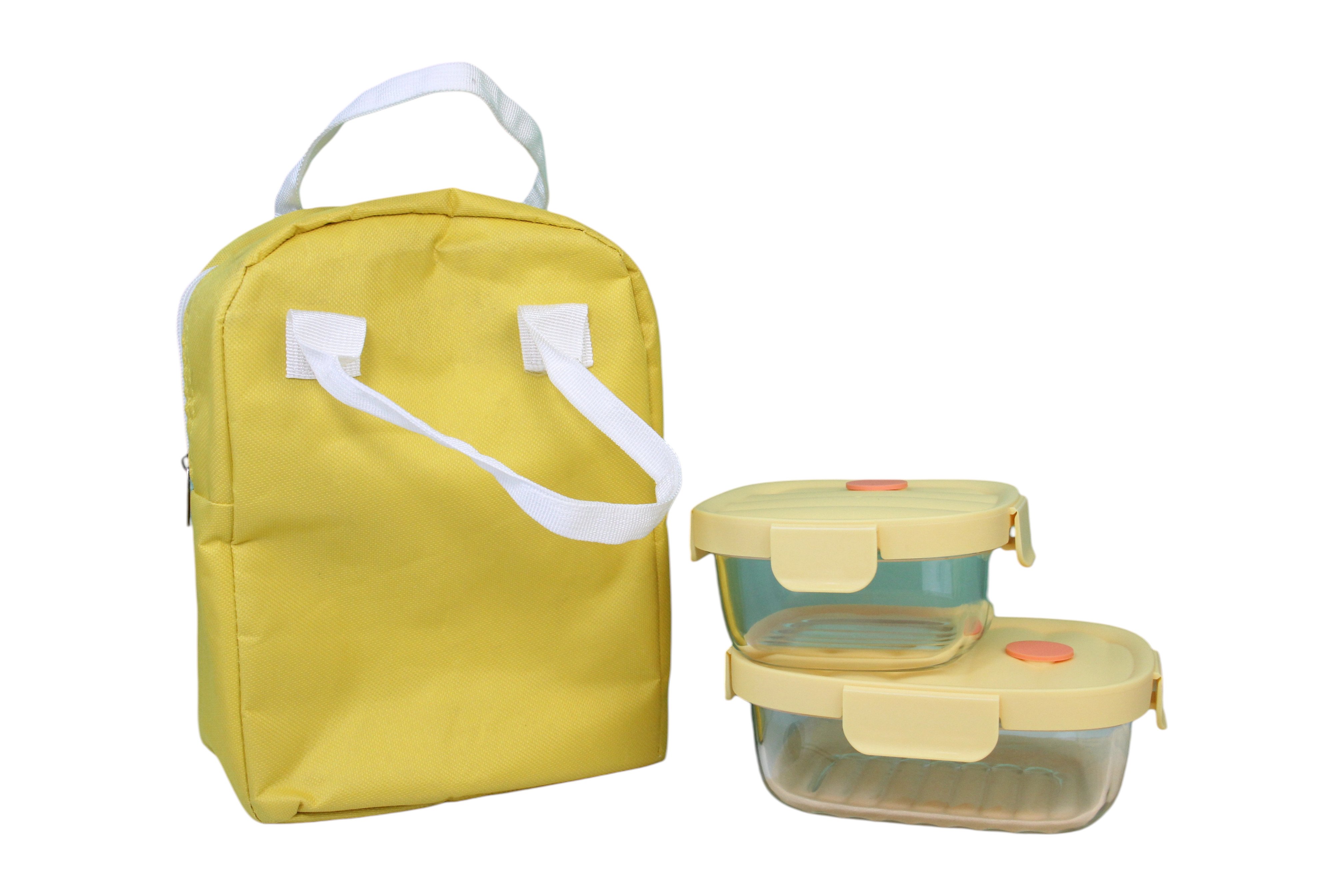 Praktická a stylová sada dvou žáruvzdorných nádob z borosilikátového skla s pevným víkem a termoizolační taškou.
