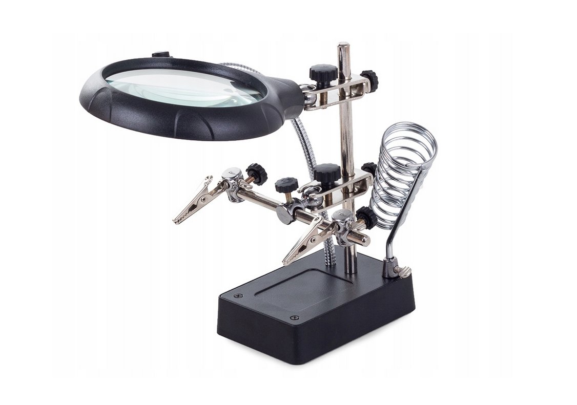 Velká lupa upevněná na stativu umožňuje její vertikální zvednutí a spouštění, je navíc vybavena držákem páječky.
