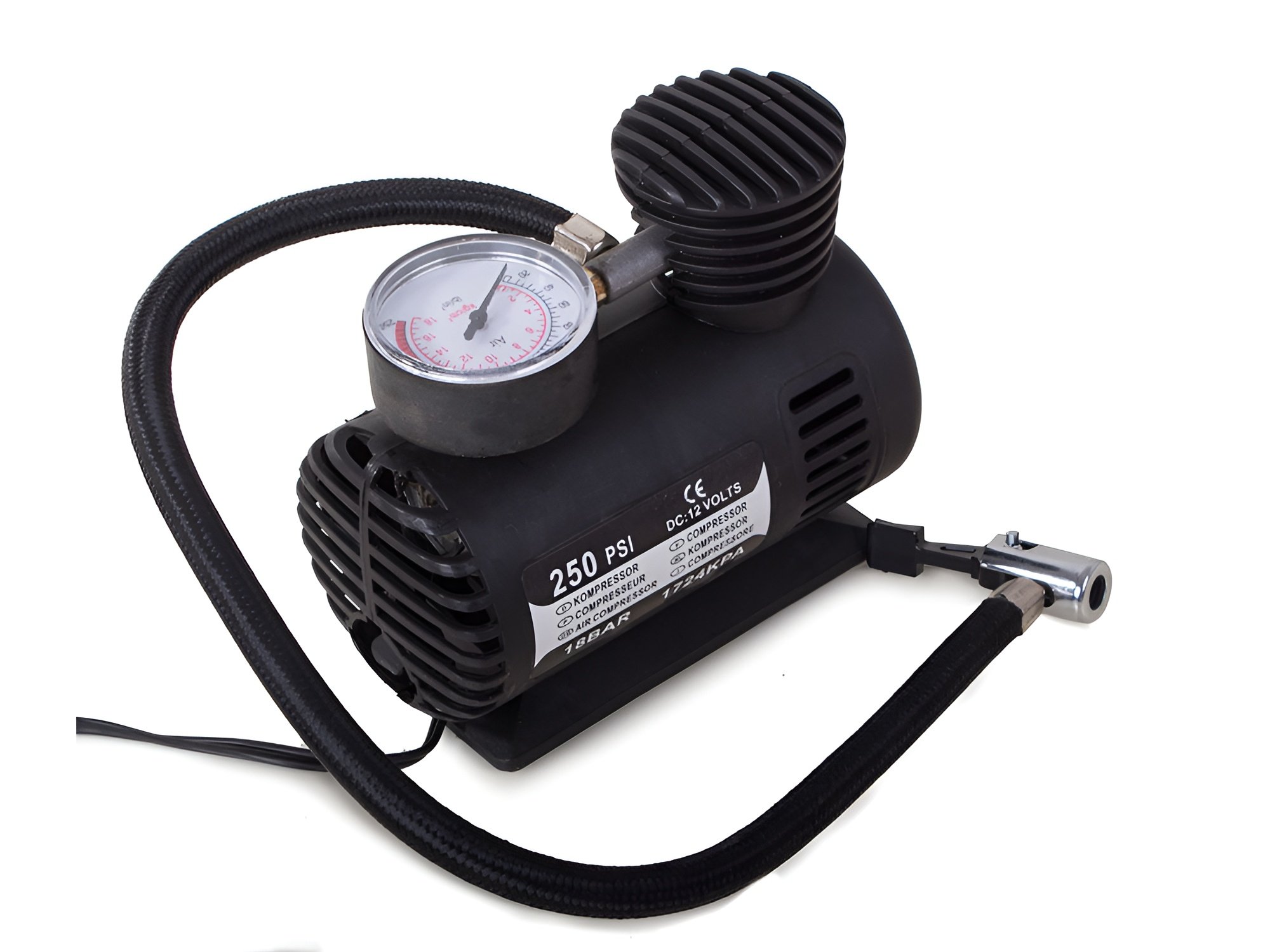 Kompresor 12 V, s manometrem, kabelem a zástrčkou do zdířky zapalovače.