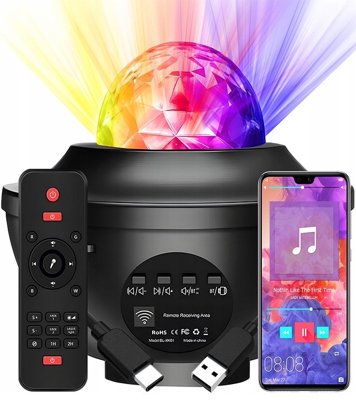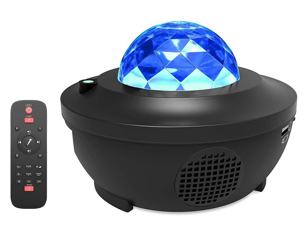 Multifunkční projektor funguje jako lampa, projektor a hudební přehrávač. Projektor pro noční osvětlení používá barvy modré, červené, zelené a bílé k vytvoření nádherné projekce. Světlo se promítá na strop a stěny místnosti, vytváří realistickou hvězdnou noční oblohu, poskytuje uvolňující atmosféru a nutí vás k procházce mezi hvězdami. Gadget stimuluje představivost dětí a pomáhá jim rychle a tiše usnout.