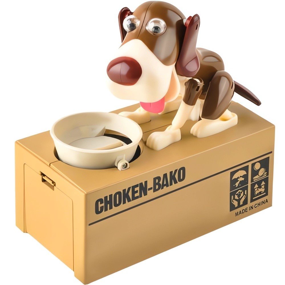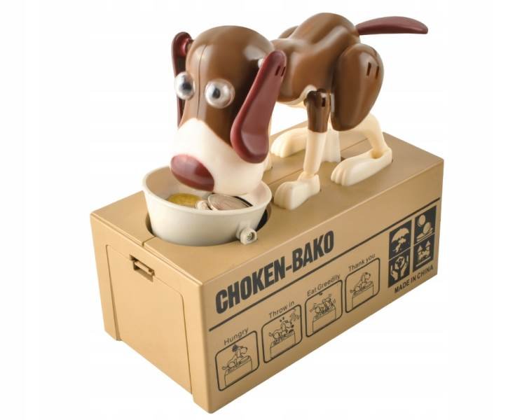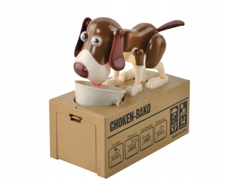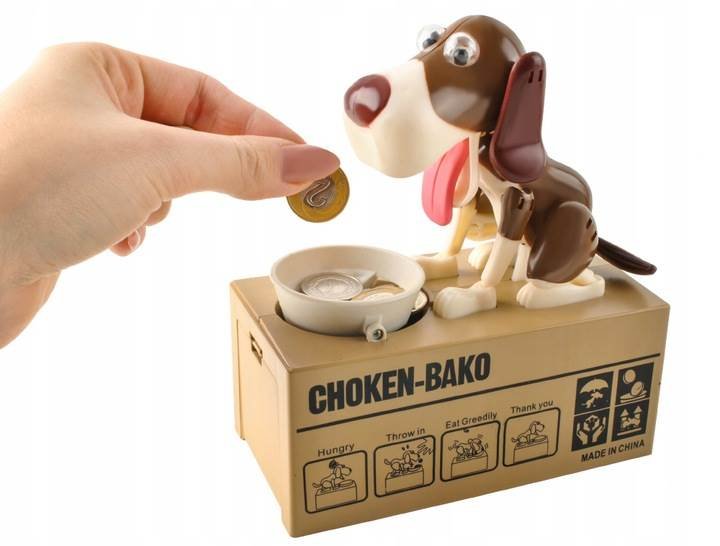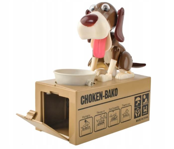 Veselá pokladnička vpodobě pejska sedícího u své misky se bude líbit především dětem Pokladnička je vybavena speciálním systémem, který dokáže rozpoznat, že byla do misky vložena mince. Vten okamžik pejsek oživne a minci vloženou na misku doslova zhltne. Díky této pokladničce se děti lépe naučí pracovat spenězi a šetřit si je. Psí pokladničku doporučujeme jako pěkný a veselý dárek pro holky i kluky.