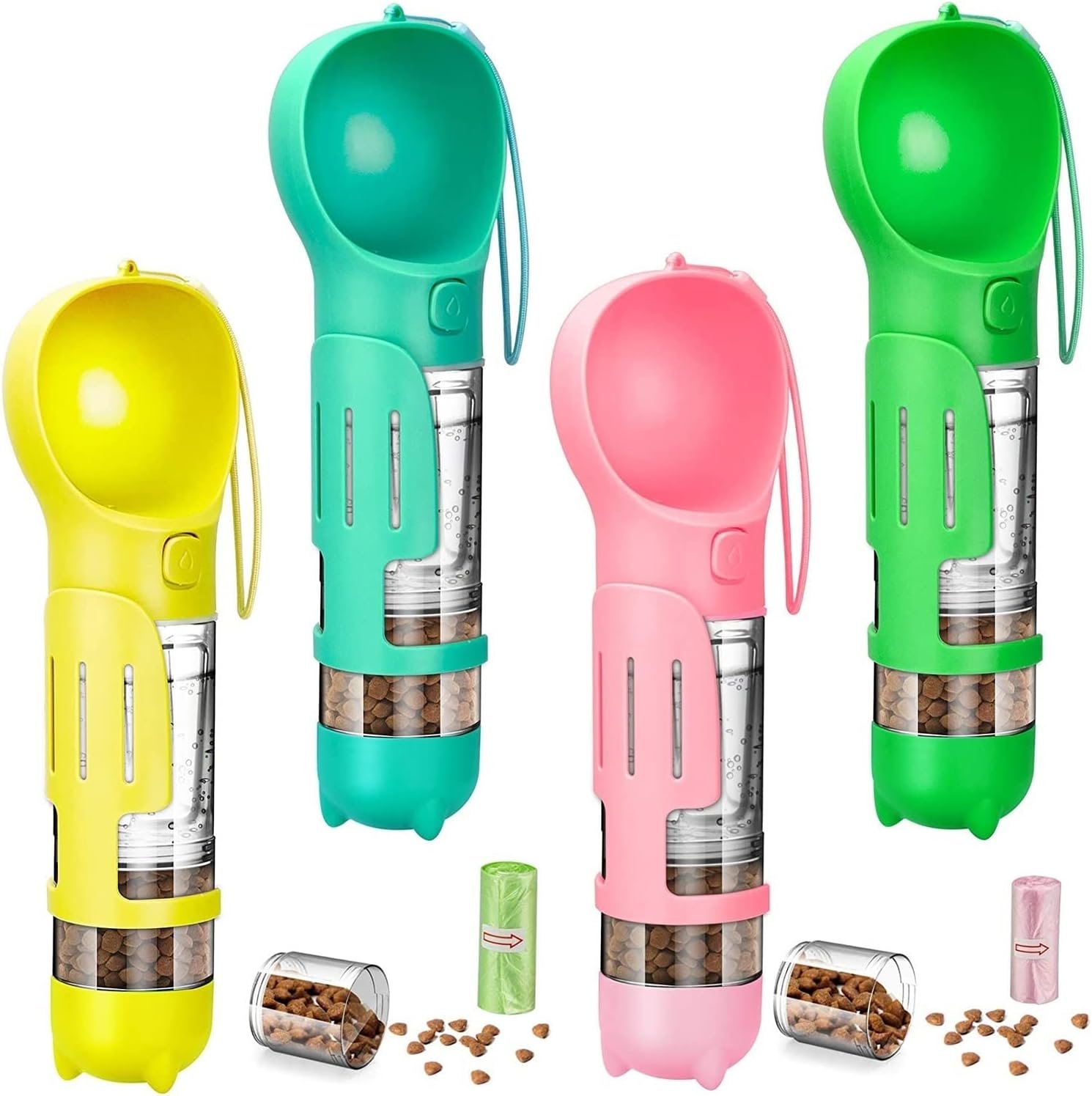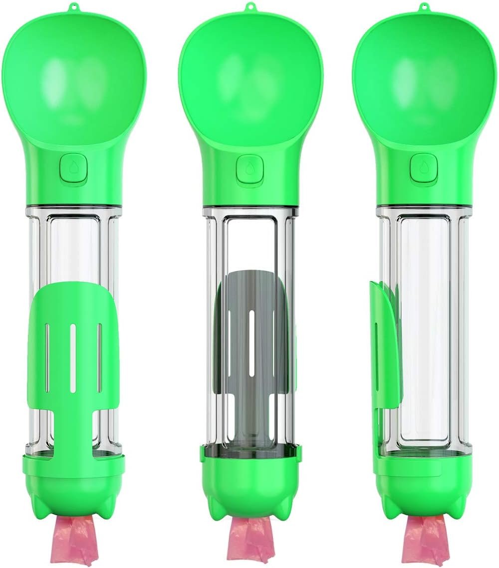 Praktická láhev na vodu pro psa, vybavená miskou na pití nebo jídlo a sáčky na exkrementy.