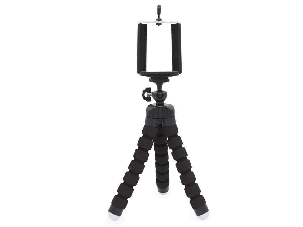 Kvalitní univerzální stativ s držákem pro mobilní telefony v černé barvě.