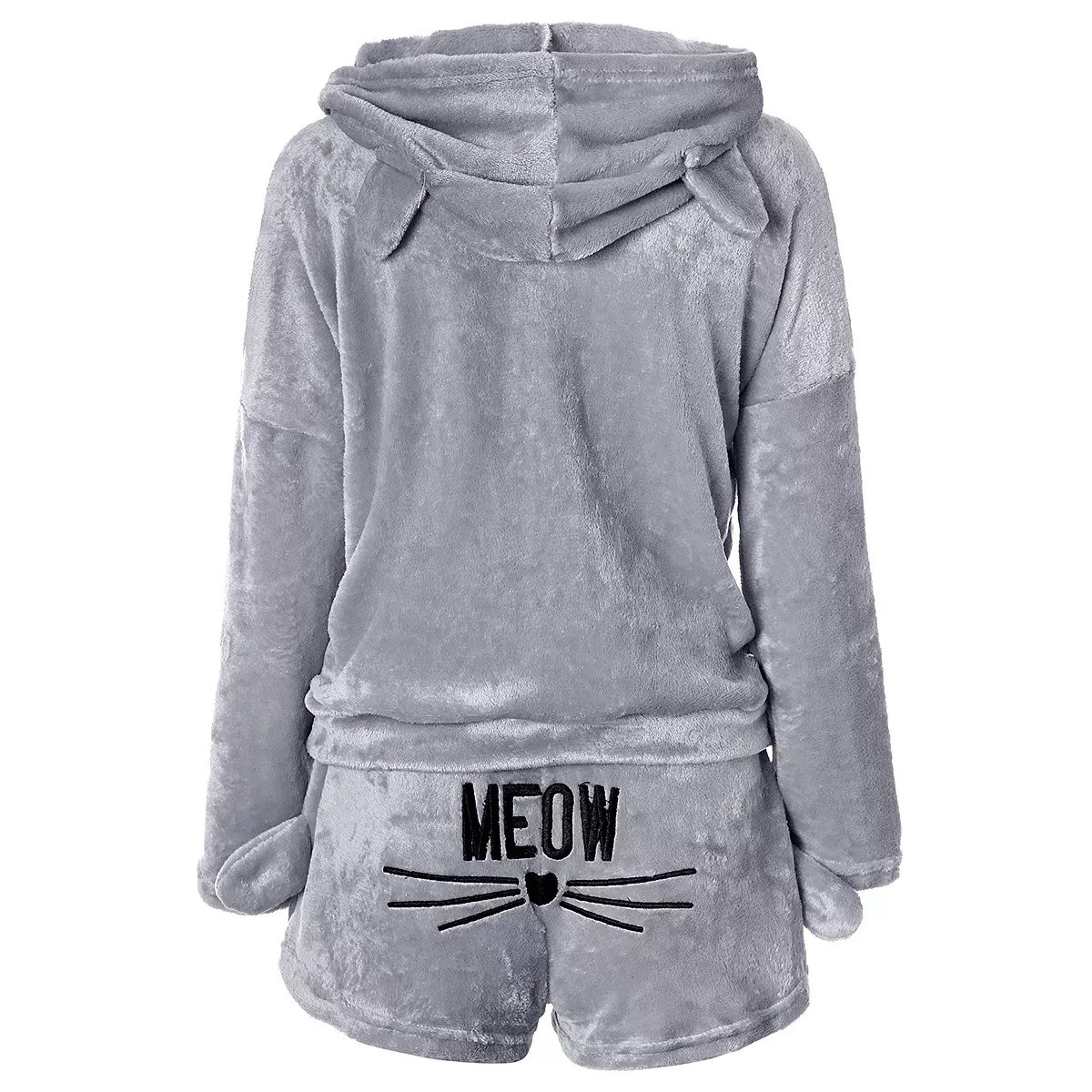 Tento pyžamový set je jako stvořený pro všechny, kteří milují kočky. Kočičí ouška na kapuci a nápis MEOW na zadečku dávají jasně najevo, kdo je v domácnosti skutečnou kočkou.