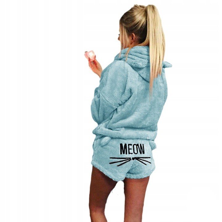 Tento pyžamový set je jako stvořený pro všechny, kteří milují kočky. Kočičí ouška na kapuci a nápis MEOW na zadečku dávají jasně najevo, kdo je v domácnosti skutečnou kočkou.