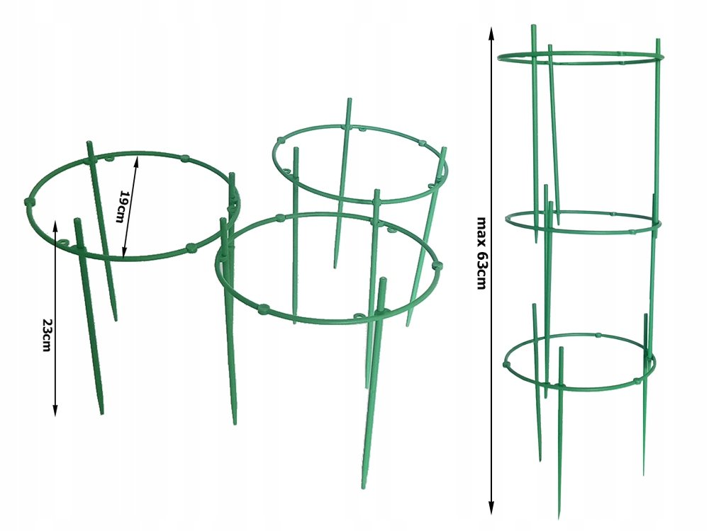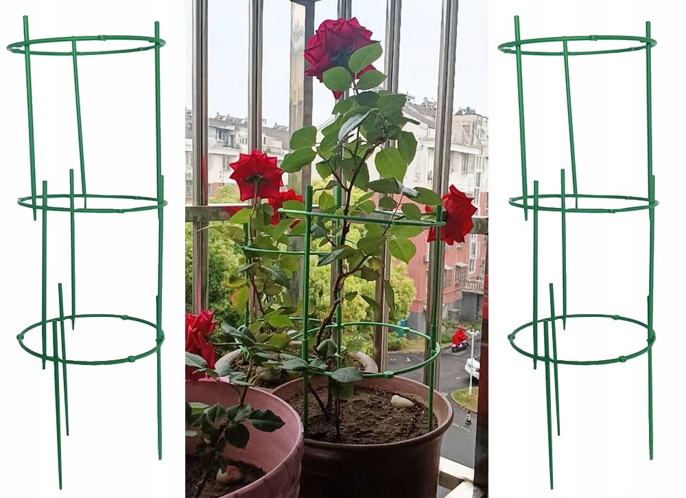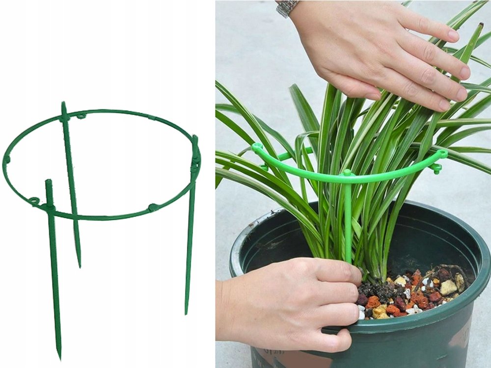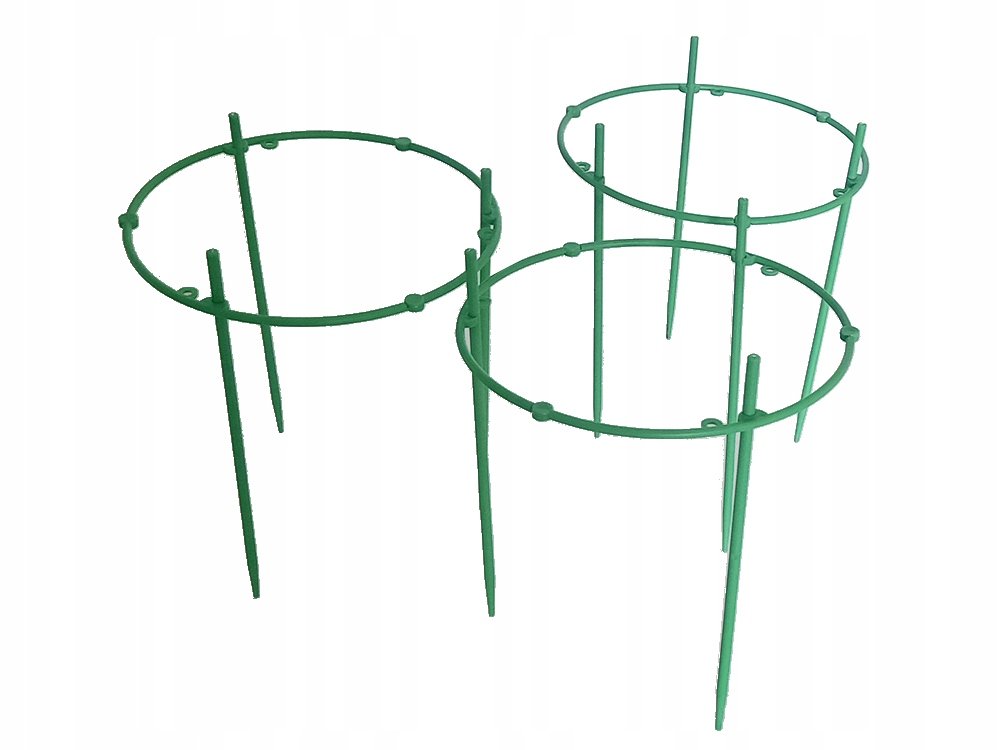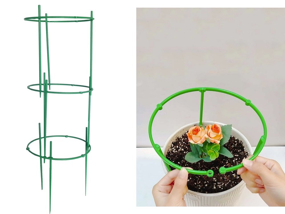 Kruhová podpěra vybavenátřemi vestavěnými kroužky pro podporu rostliny při jejím růstu. Tato konstrukce se skládá ze tří plastových kroužků, které jsou umístěny kolem stonku rostliny a poté připevněny k zemi. Podpora poskytuje oporu rostlinám a umožňuje jim růst vertikálně. Chrání je také před pověšením nebo zlomením pod tíhou květů nebo listů.