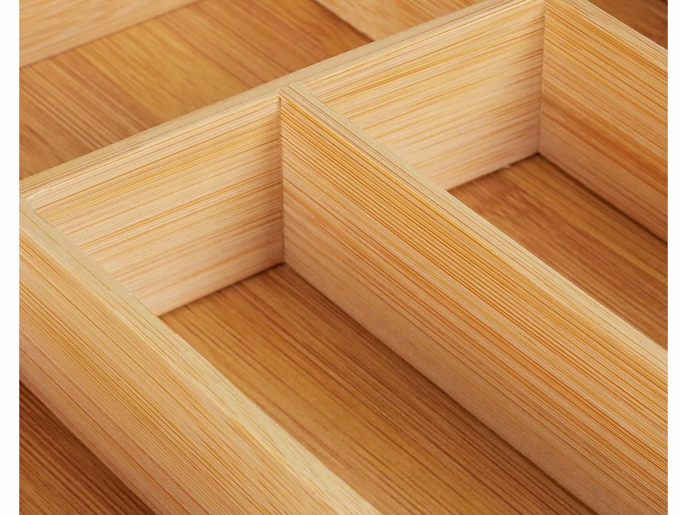 Organizér do kuchyňských zásuvek vyrobený z bambusového dřeva má jednoduchý tvar, díky kterému se hodí do moderních kuchyní.