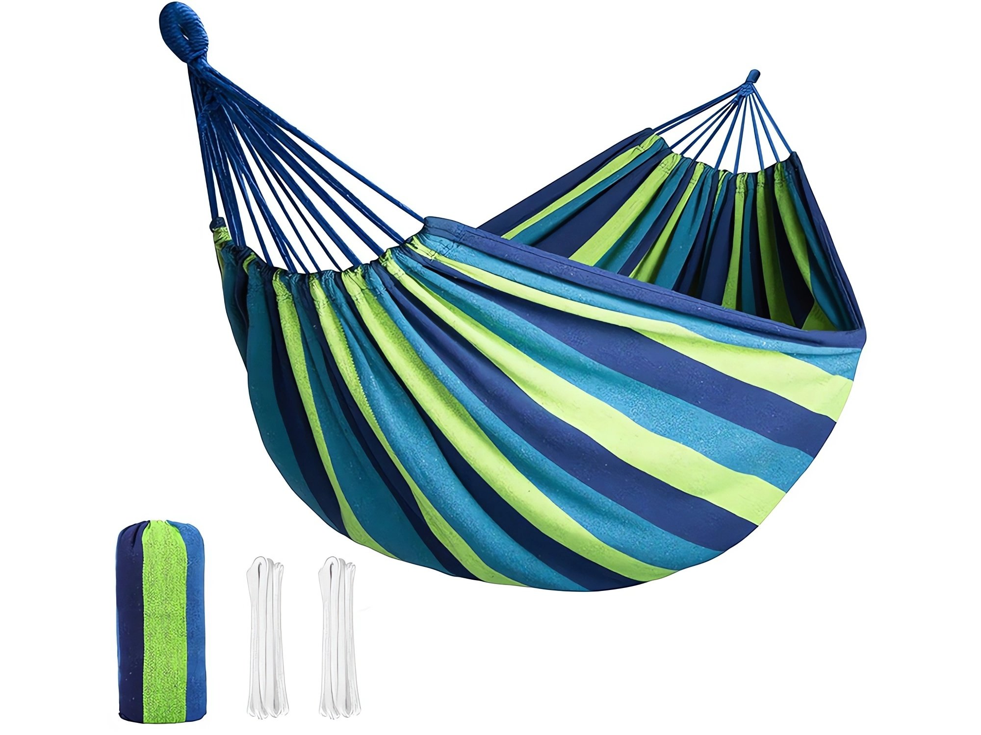 Zahradní houpací síť pro dvě osoby je perfektní věc pro každého, kdo rád tráví svůj volný čas v lůně přírody. Stačí přivázat dva konce houpací sítě ke stromům nebo pevným sloupkům a užívat si pohodlí. Sada obsahuje dva provázky, kterými můžeme houpací síť připevnit. Můžete si například číst knihu a přitom se jemně houpat v měkké houpací síti.