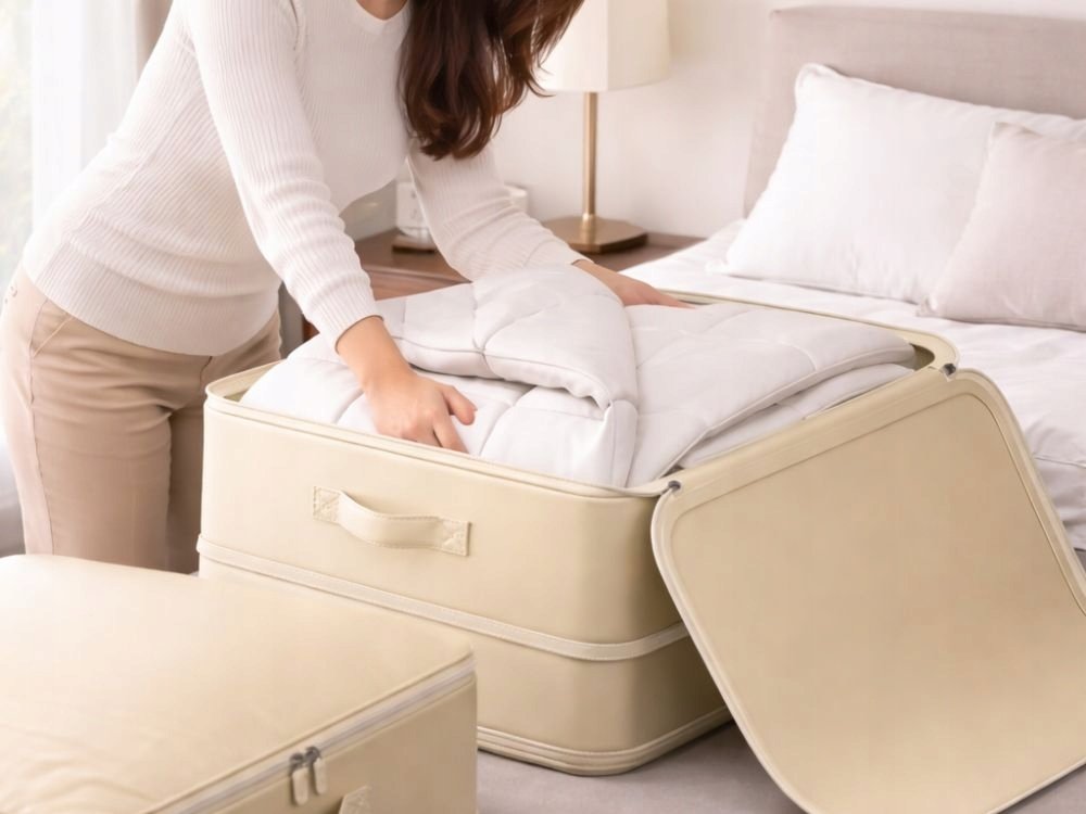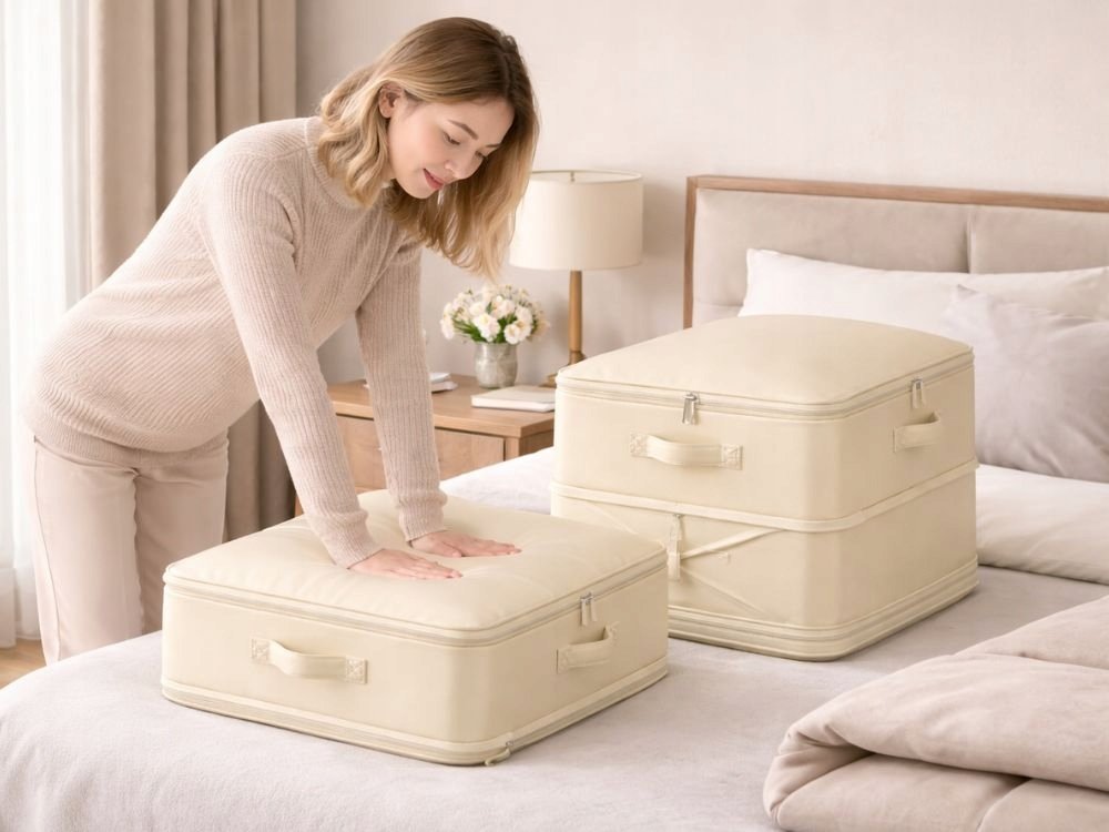 Taška je vybavena praktickými rukojeťmi pro snadné přenášení. Ať už ji chcete vyjmout ze skříně, přemístit do jiné místnosti nebo si ji vzít s sebou – vše je rychlé a pohodlné.