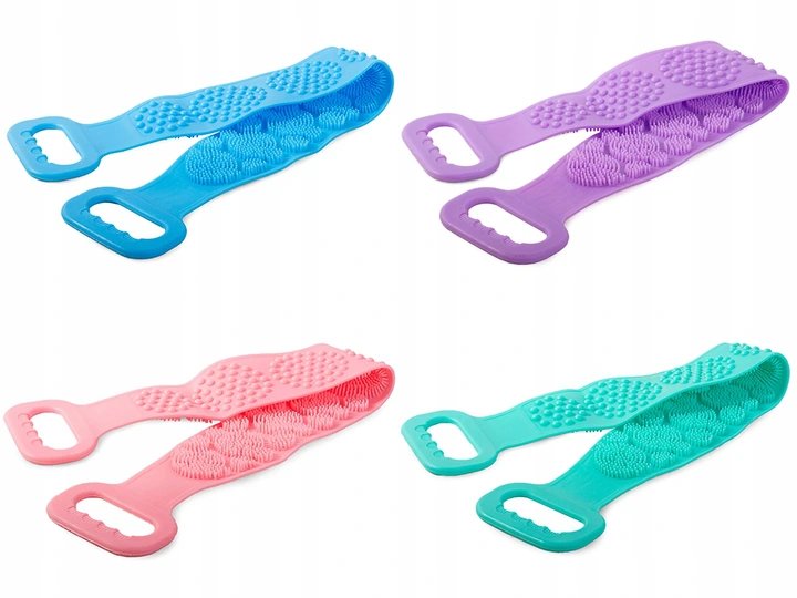 Oboustranný elastický pás do sprchy, který má na jedné straně štětinky na čištění a masáž pokožky, a na druhé masážní výstupky pro perfektní masáž svalů.